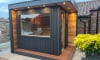 Black half round PVCu guttering runs along the entire rear elevation of the garden sauna and is connected to a PVCu down pipe and outlet. The insulated roof has a 3-4 degree slop from the front to the rear - allowing rainwater to flow to the rear guttering and downpipe outlet.