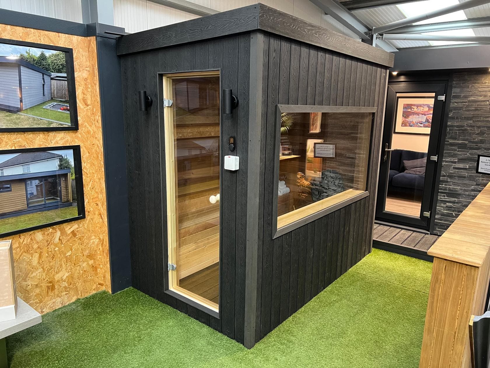 Unlike traditional timber cladding, our woodgrain composite cladding does not require staining, varnishing or sanding throughout its lifespan. As standard we externally clad our garden saunas in black woodgrain composite cladding as this contrasts especially well with the Western Red Cedar integral cladding. However we can offer a range of eight different colours - Redwood, Olive Green, Ivory, Teak, Coffee, Charcoal (Black), Light Grey and Stone Grey.