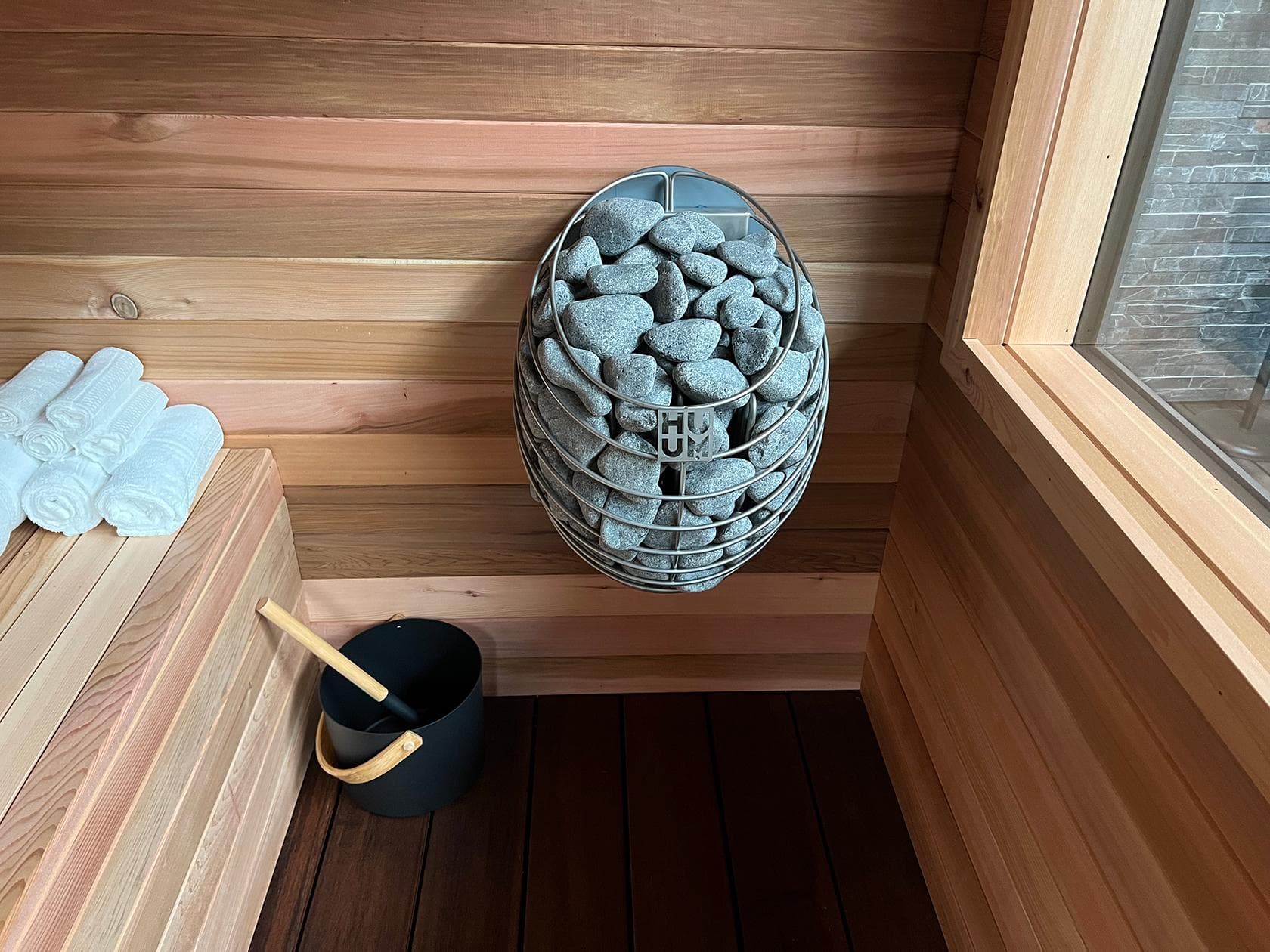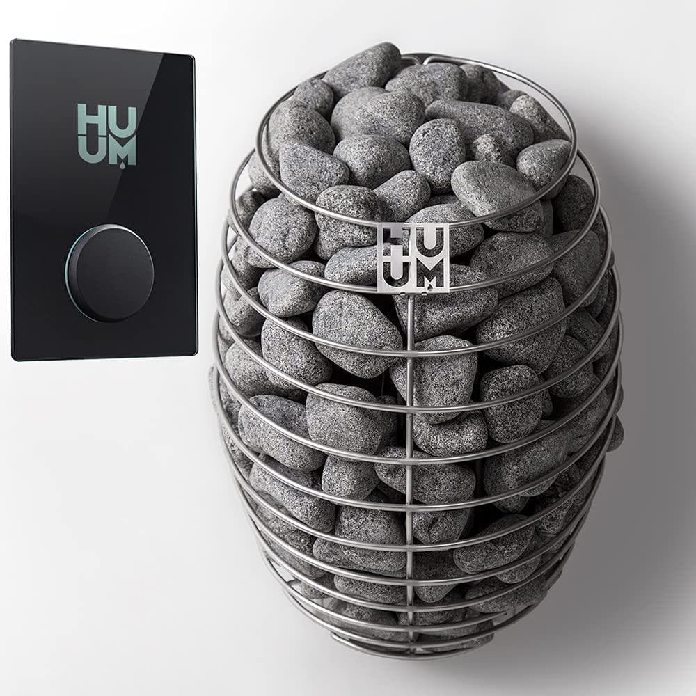We include the correct amount of genuine HUUM rounded stones with each heater supplied. HUUM emphasizes the use of natural, round sauna stones, such as olivine diabase, to achieve optimal thermal performance and durability.