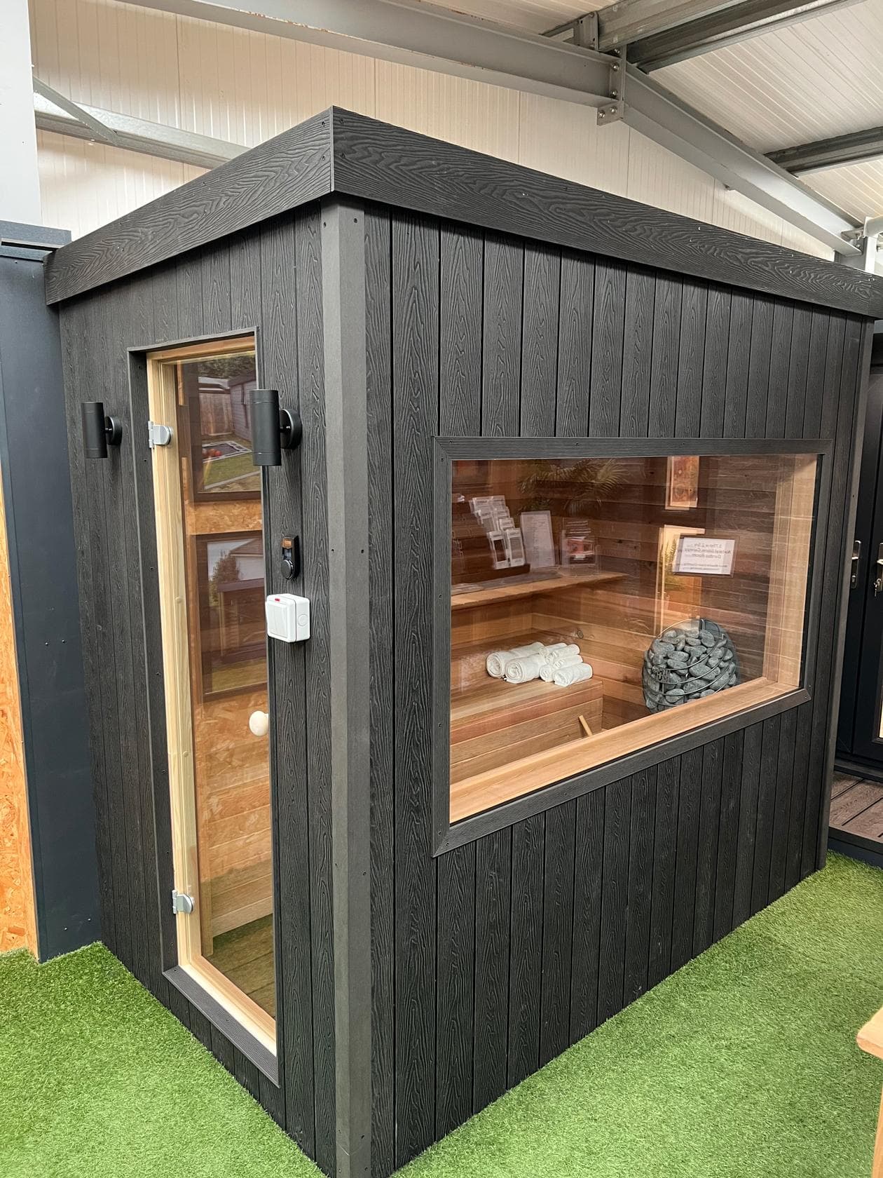 The insulated garden sauna timber walls are externally wrapped in a specialist high performance waterproof breathing membrane. This membrane acts like a one way valve and allows natural moisture to escape out of the garden shed - but prevents moisture from entering the building. Additionally all internal walls are wrapped in a specialist sauna aluminium heat reflector\ moisture barrier.